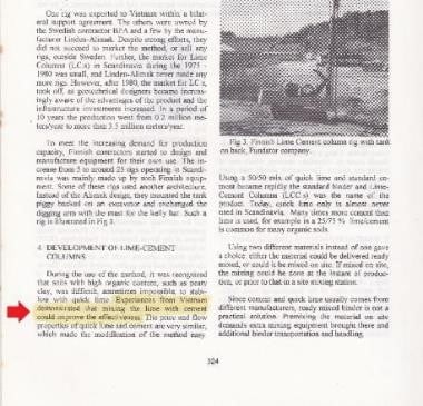 In the international conference on “Dry Mix Methods for Deep Soil Stabilization”, Stockholm (1999), in his “Keynote lecture: Equipment for deep soil mixing with the dry jet mix method”, Dr. Håkan Bredenberg, the chairman of the conference organizing committee, emphasized that: “Experience from Vietnam demonstrated that mixing lime with cement could improve the effectiveness”, see page 324 of the conference proceedings. Although this is not entirely true as in the studies at IBST, only cement was used as a binder, without lime. Using a 50/50 mix of quick lime and standard cement became rapidly the standard binder and Lime Cement Columns (LCC method) was named for the method. This method is still very common in Scandinavia. Today, quick lime only is almost never used in Scandinavia. Many time more cement than lime is used, for example in a 25/75% lime/cement is common for many organic soils.
