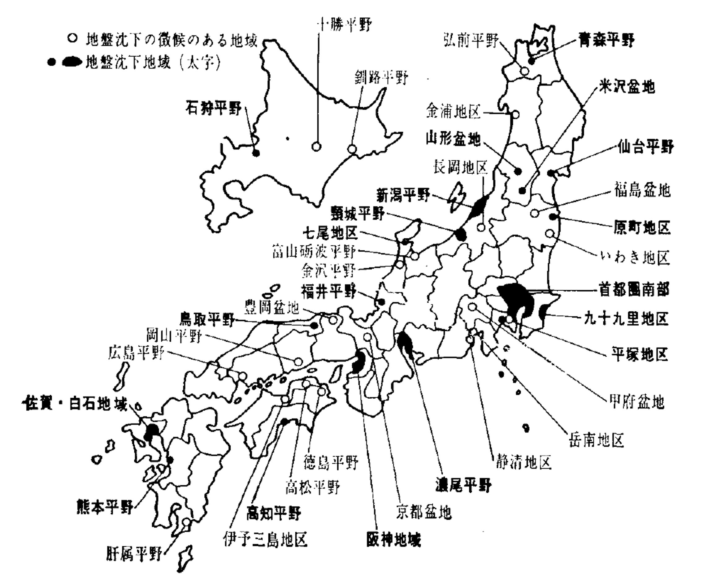 ![]() Areas suffering ground settlement (black fill) and those with signs of it (white marker) in 1974 (Kutara, 1975) |